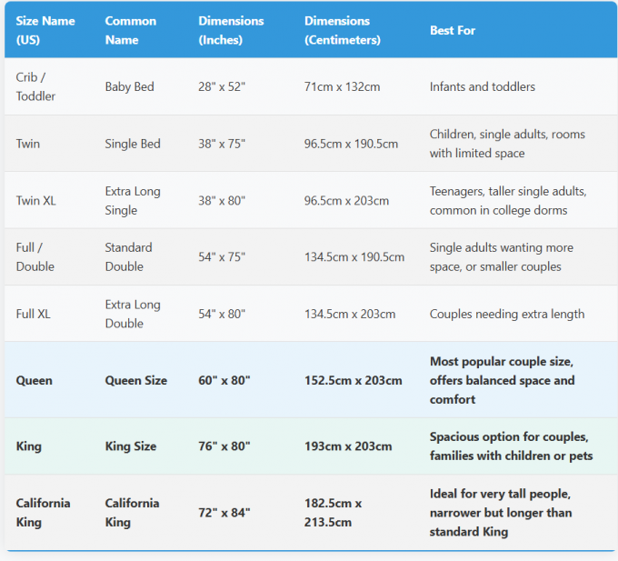 Tất cả các kích thước giường có sẵn bao gồm kích thước đặc biệt